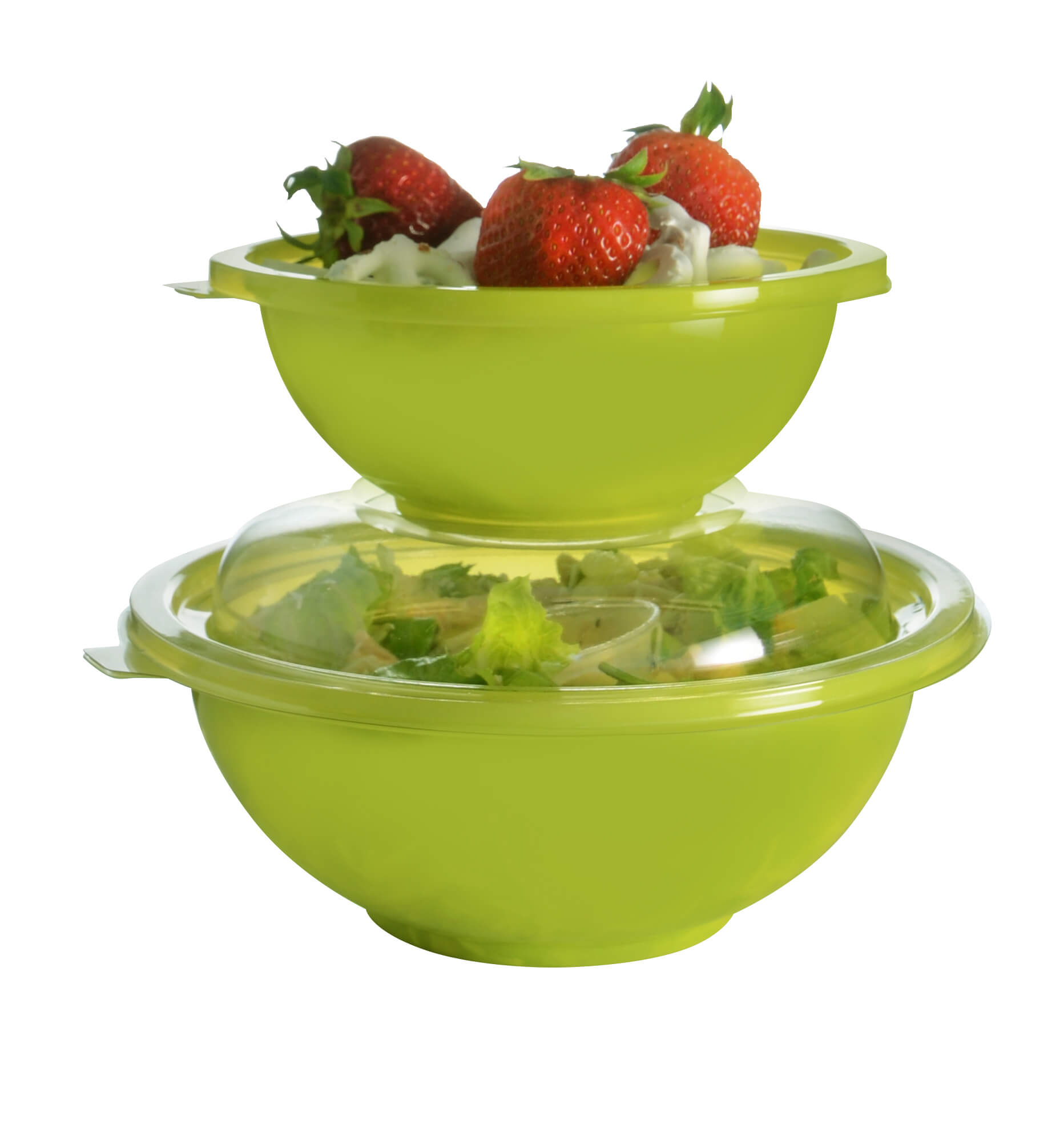 Package your salads, desserts, fruits, and more with this Fineline 5032-GRN Super Bowl 32 oz. Green PET Plastic Salad Bowl which is presentable yet convenient. These bowls make a beautiful display on the shelf and even better, they are designed with the consumer in mind. Your guests will be able to enjoy their meal out of the dish without needing to use additional plates etc.