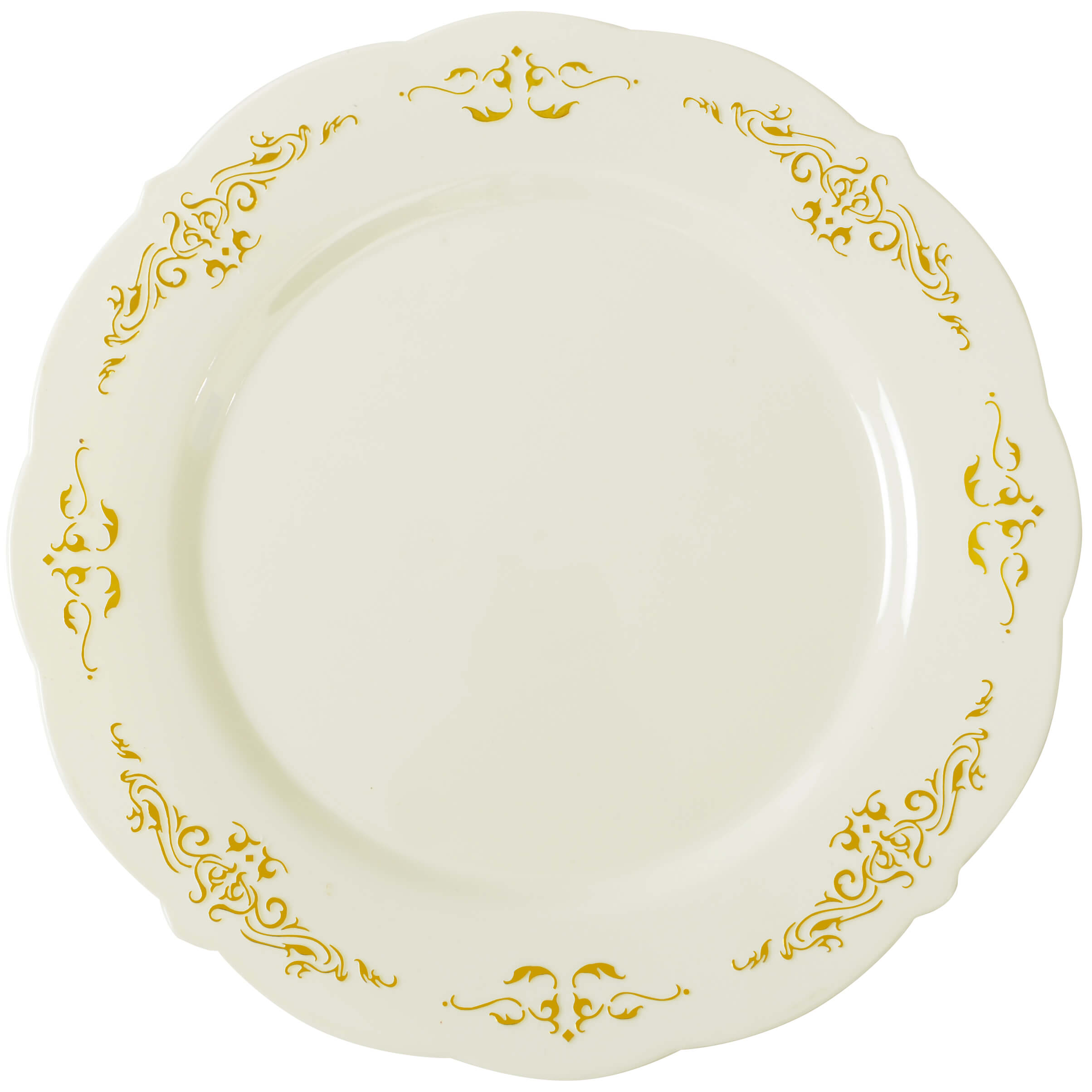 Fineline 5975-BOG Heritage 7 1/2″ Round Bone / Ivory Plastic Plate with Gold Trim – 120/Case