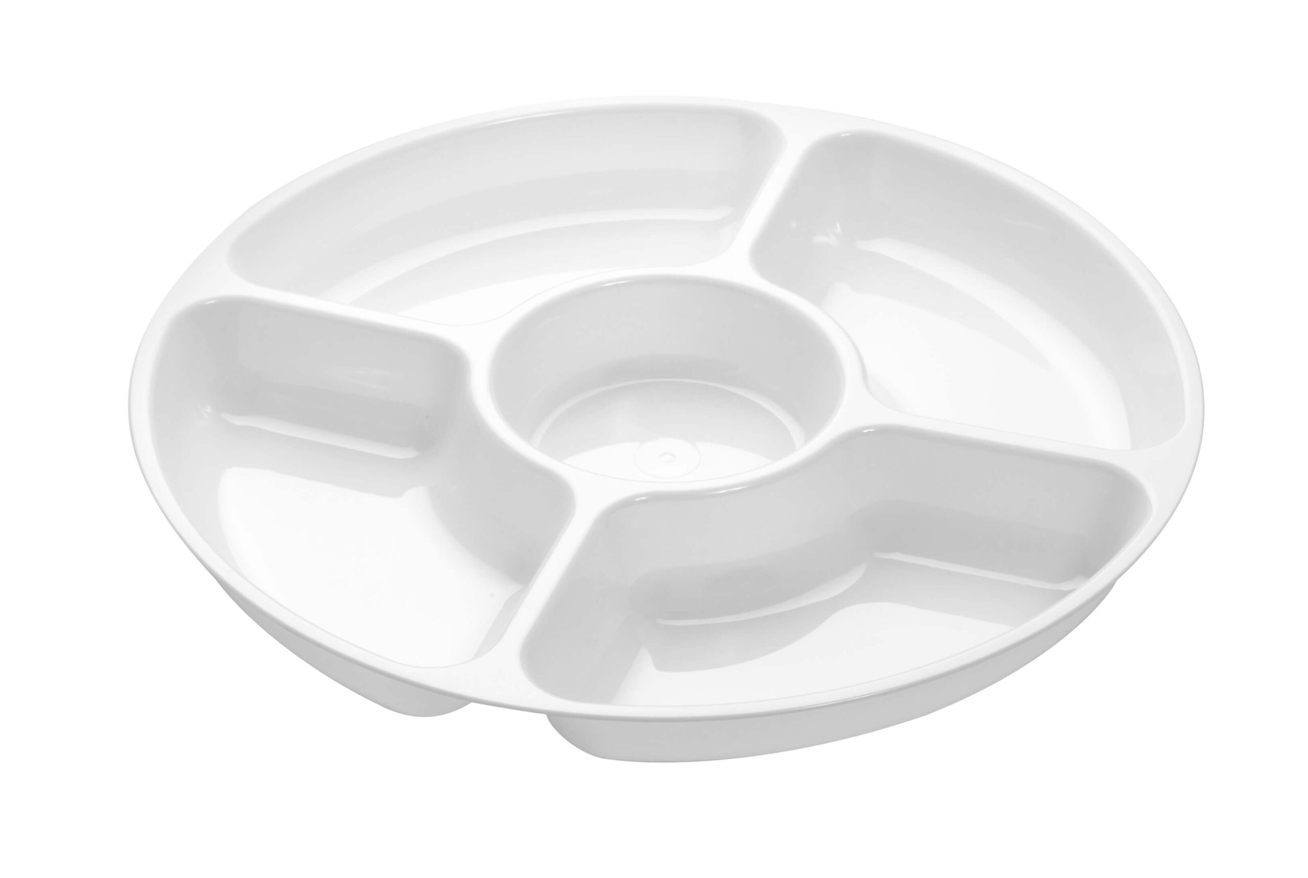 How can I showcase several sweets in one big dish? Don’t bother! Get Fineline Platter Pleasers 3506-WH 12″ 5 Compartment White Polystyrene Deli / Catering Tray! This tray has 4 compartments which are evenly divided around the tray’s rim to display multiple types of nuts, candies, chips, appetizers etc. Plus, there is one smaller round compartment in the center making it perfect if you want to add dips, sauces, or even blueberries, pomegranates or cherry tomatoes.