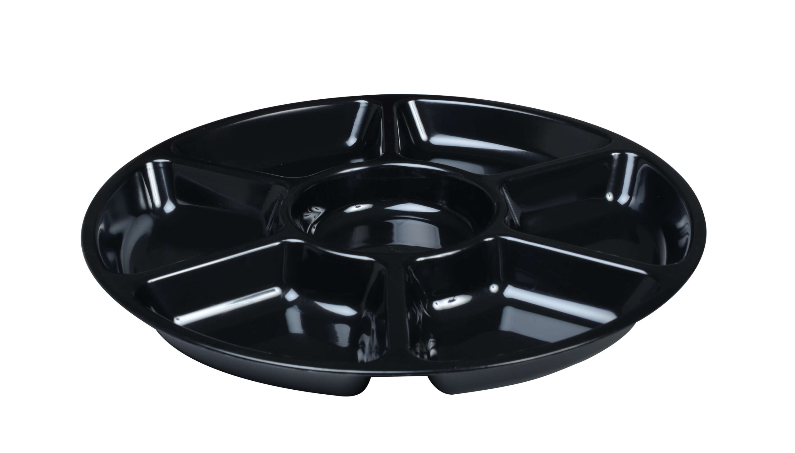 How can I showcase several sweets in one big dish? Don’t bother! Get Fineline Platter Pleasers 3507-BK 14″ 7 Compartment Black Polystyrene Deli / Catering Tray! This tray has 6 compartments which are evenly divided around the tray’s rim to display multiple types of nuts, candies, chips, appetizers etc. Plus, there is one smaller round compartment in the center making it perfect if you want to add dips, sauces, or even blueberries, pomegranates or cherry tomatoes.