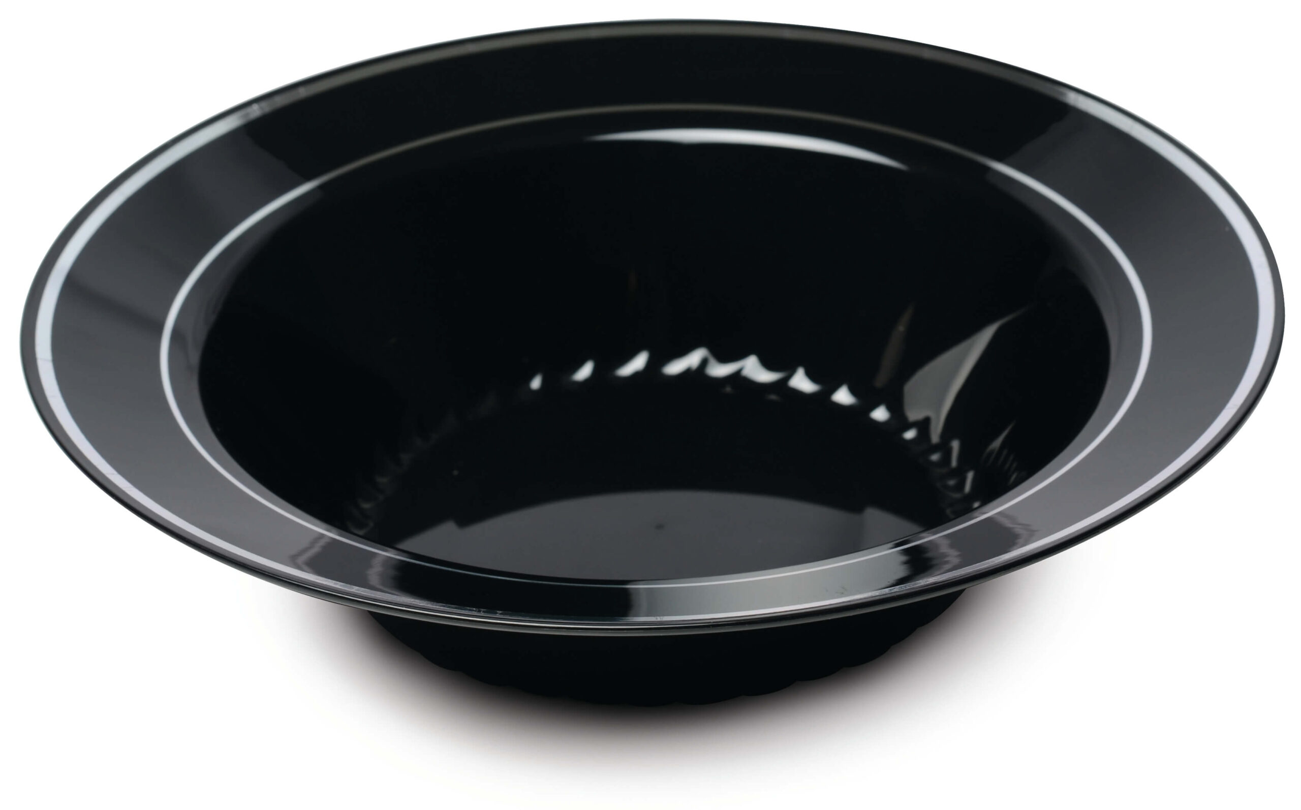 When expectations are heightened, it’s time for a setting that’s enlightened. ThisFineline Silver Splendor 512-BKS Black 12 oz. Plastic Soup Bowl with Silver Bands will set your party’s ton¬e of elegance! As a perfect solution for your next party, catered event or gathering, this plate is sure to add a touch of spice to your food’s appearance! With it’s simple yet up-to-date design and high-gloss finish it resembles true china dishes. Still, this plate is disposable treating your staff to an easy clean-up. Your waiters too will enjoy the ease of handling these plates. Although they’re made of heavy duty plastic, when compared to china, they are lightweight, stackable and easy to handle. It’s the ideal for serving your hot or cold food or even presenting some miniatures or hors d’oeuvres.