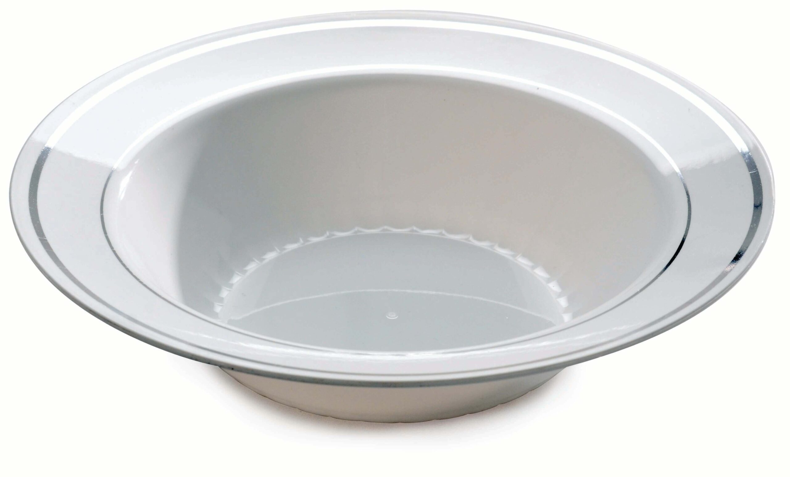When expectations are heightened, it’s time for a setting that’s enlightened. This Fineline Silver Splendor 512-WH White 12 oz. Plastic Soup Bowl with Silver Bands will set your party’s ton¬e of elegance! As a perfect solution for your next party, catered event or gathering, this plate is sure to add a touch of spice to your food’s appearance! With it’s simple yet up-to-date design and high-gloss finish it resembles true china dishes. Still, this plate is disposable treating your staff to an easy clean-up. Your waiters too will enjoy the ease of handling these plates. Although they’re made of heavy duty plastic, when compared to china, they are lightweight, stackable and easy to handle. It’s the ideal for serving your hot or cold food or even presenting some miniatures or hors d’oeuvres.