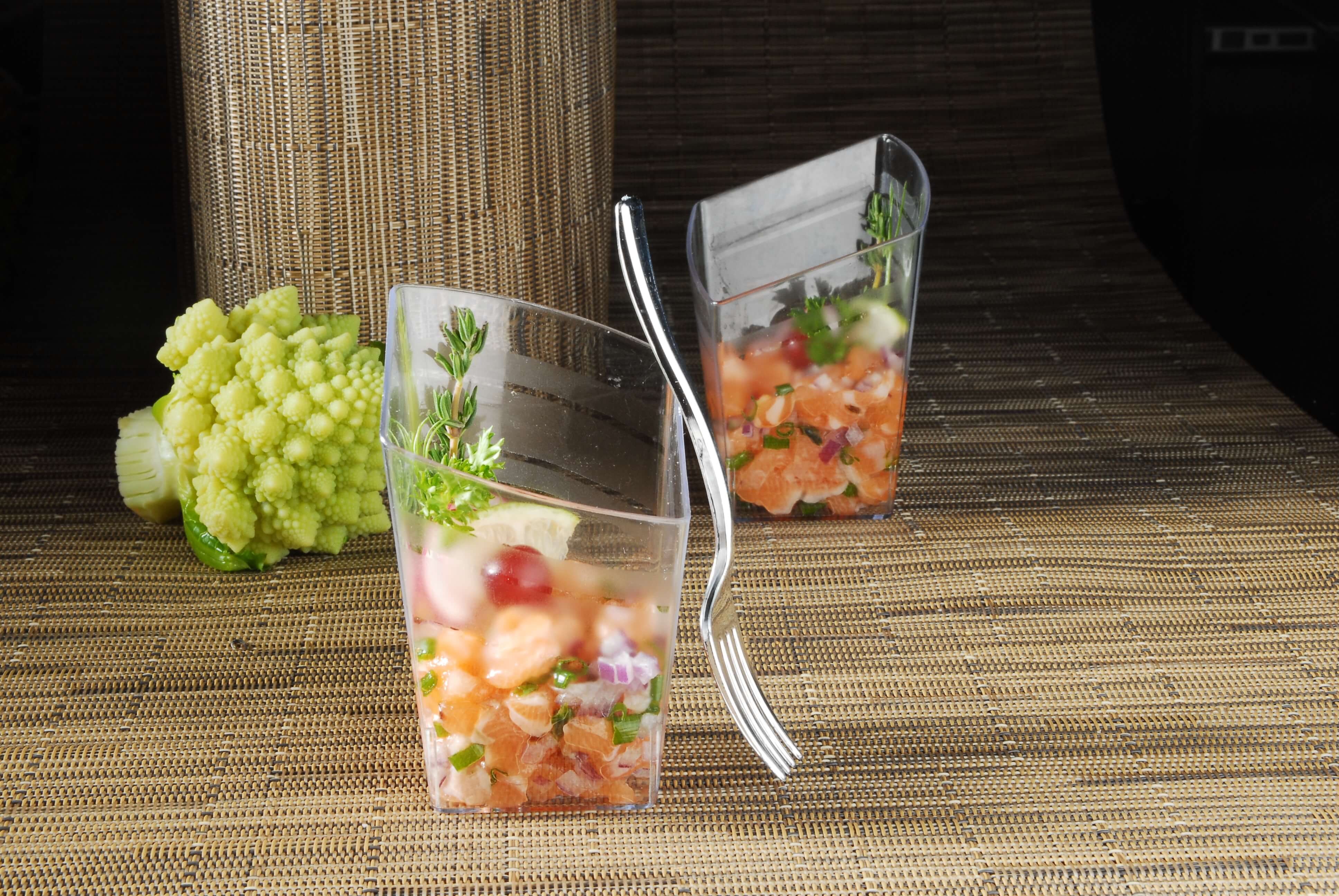 How can I perfectly portion my appetizer? Use this Fineline Tiny Temptations 6407-CL 2.2 oz. Tiny Trifles Clear Plastic Bowl! These are great not only for appetizers, but also for miniatures, hors d’oeuvres, desserts, or any of your savory dish! Enjoy the neat look of your edibles in this perfect tray which has raised edges to prevent products from falling off.