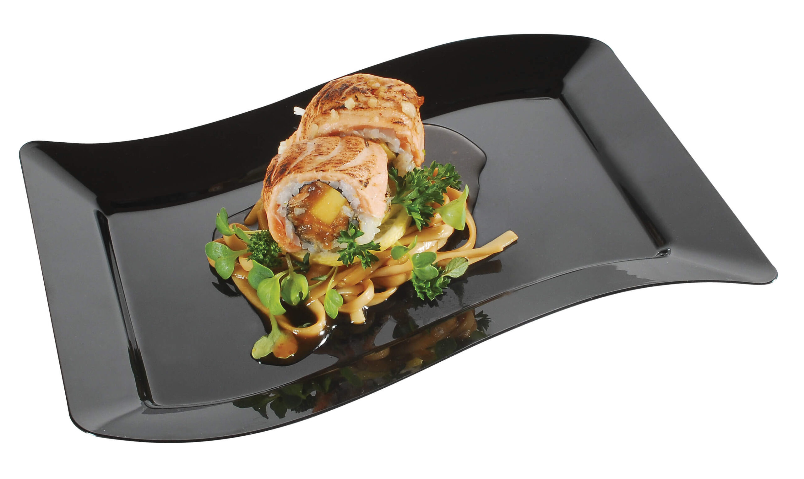 When expectations are heightened, it’s time for a setting that’s enlightened. This Fineline Wavetrends 1406-BK 6 1/2″ x 10″ Black Plastic Salad Plate will set your party’s ton¬e of elegance! As a perfect solution for your next party, catered event or gathering, this plate is sure to add a touch of spice to your food’s appearance! With it’s simple yet up-to-date design and high-gloss finish it resembles true china dishes. Still, this plate is disposable treating your staff to an easy clean-up. Your waiters too will enjoy the ease of handling these plates. Although they’re made of heavy duty plastic, when compared to china, they are lightweight, stackable and easy to handle. It’s the ideal for serving your hot or cold food or even presenting some miniatures or hors d’oeuvres.